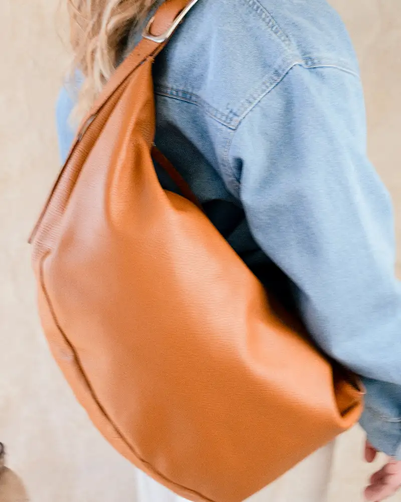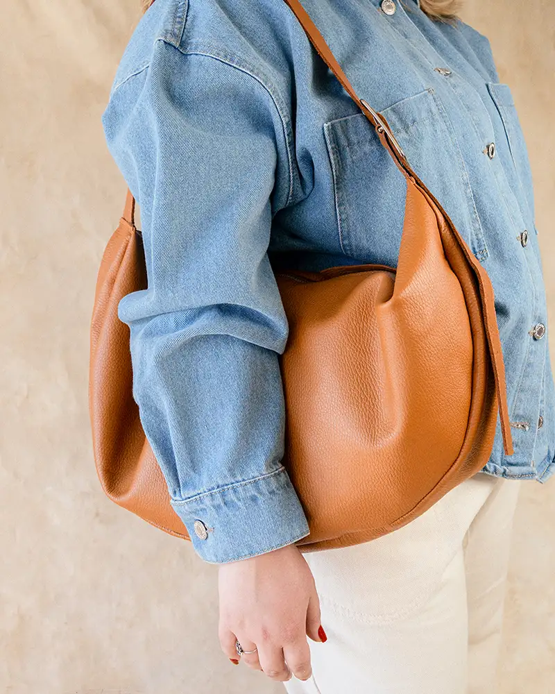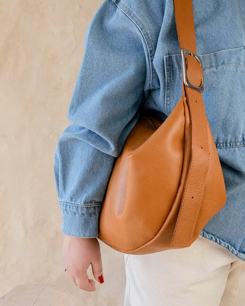 Cartera ovalada de cuero suela con hebilla reguladora en la correa