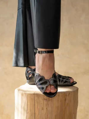 Sandalias bajitas de cuero charol negro combinadas con negro salpicado en acero metalizado