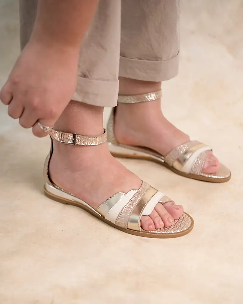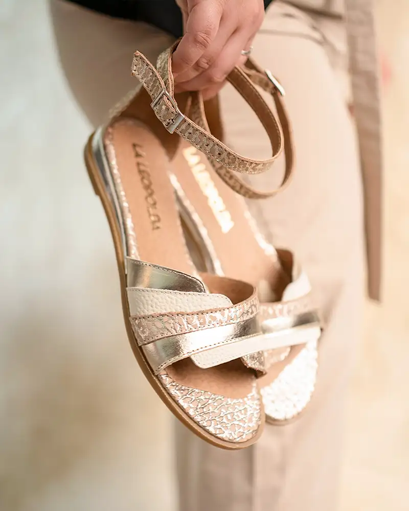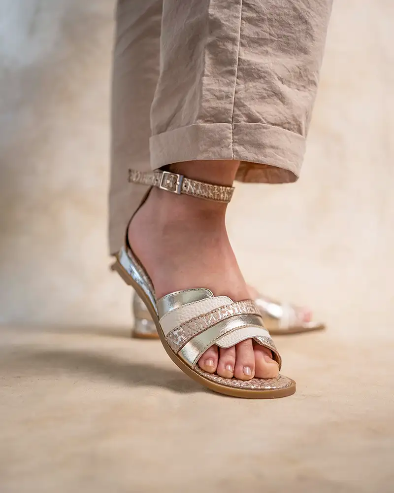Sandalias bajitas en cuero metalizado beige y platino Trelix
