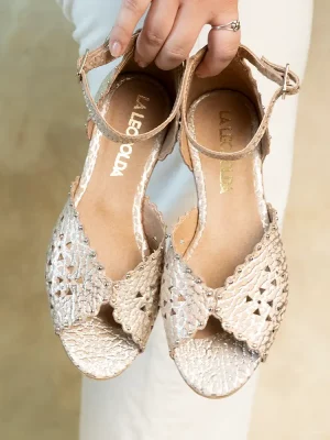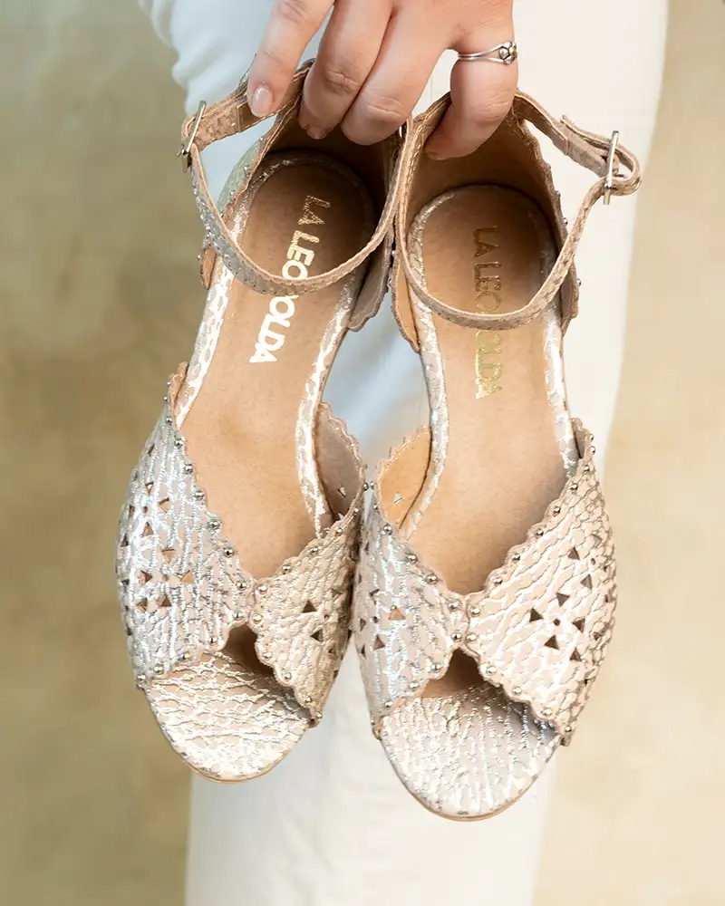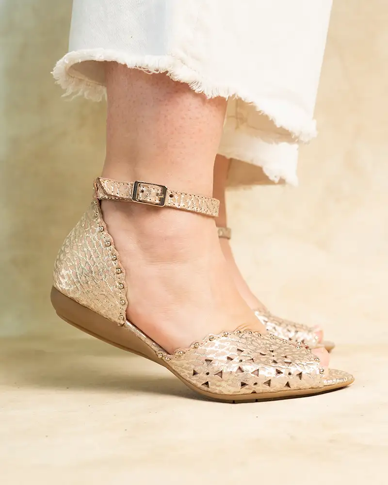 Sandalias bajas de cuero platino calado con pulsera al tobillo Alesia