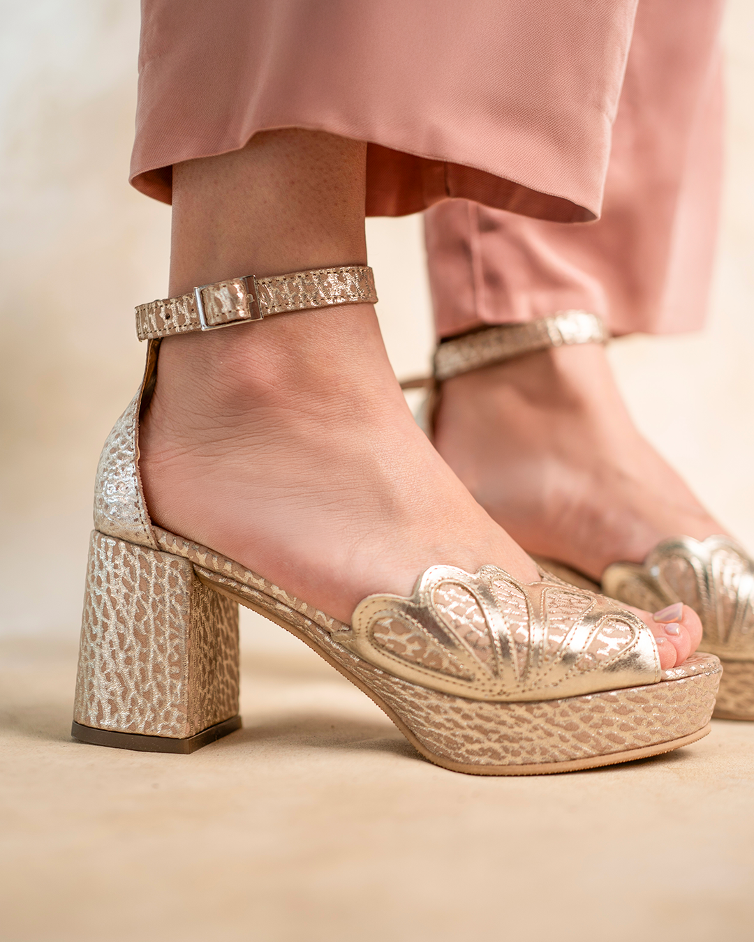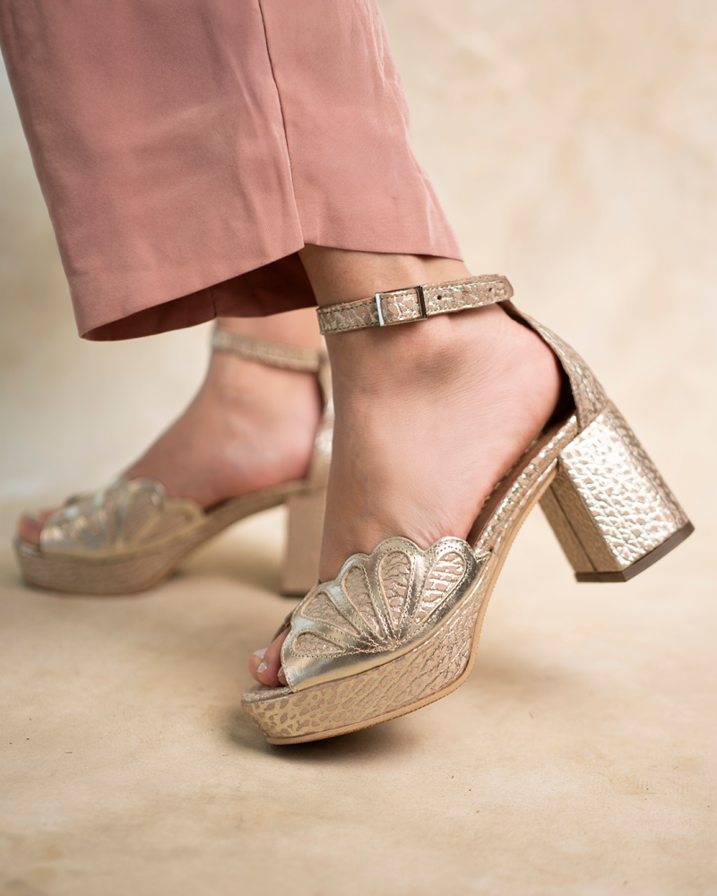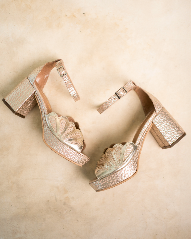 Sandalias de cuero color platino metalizado con plataforma y taco alto