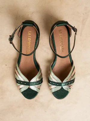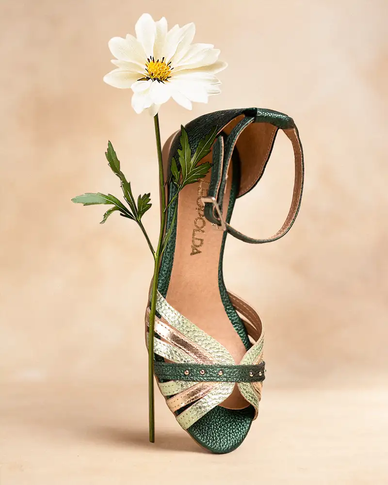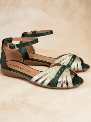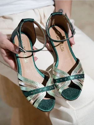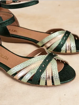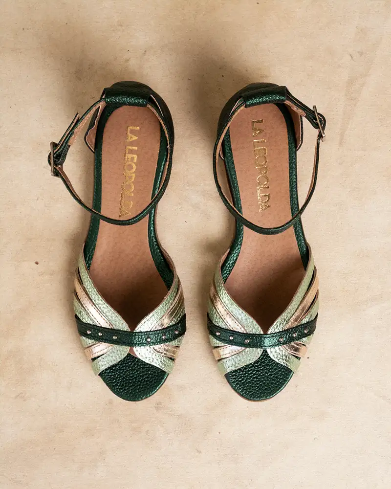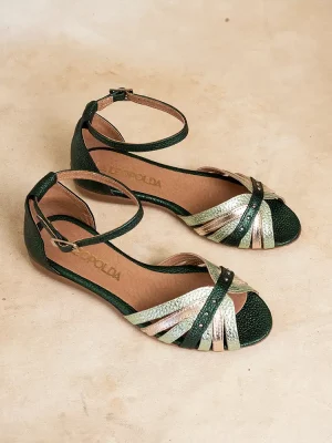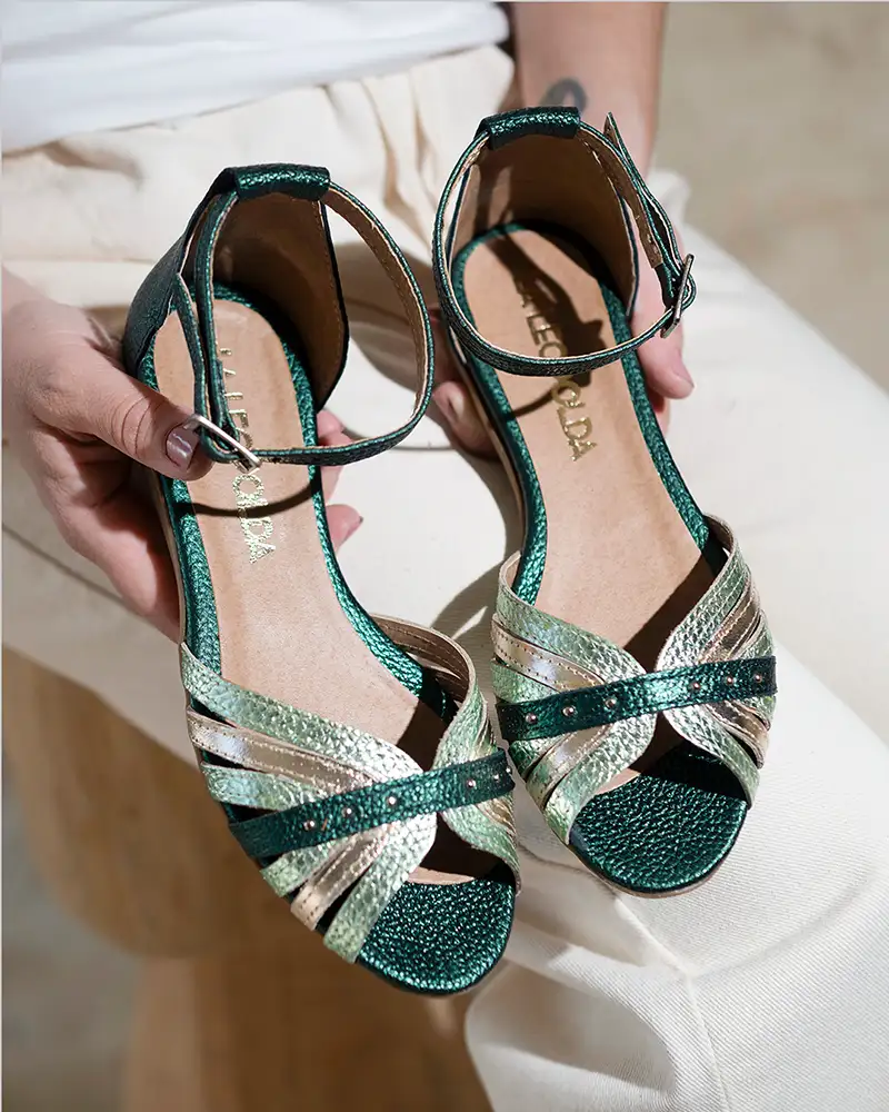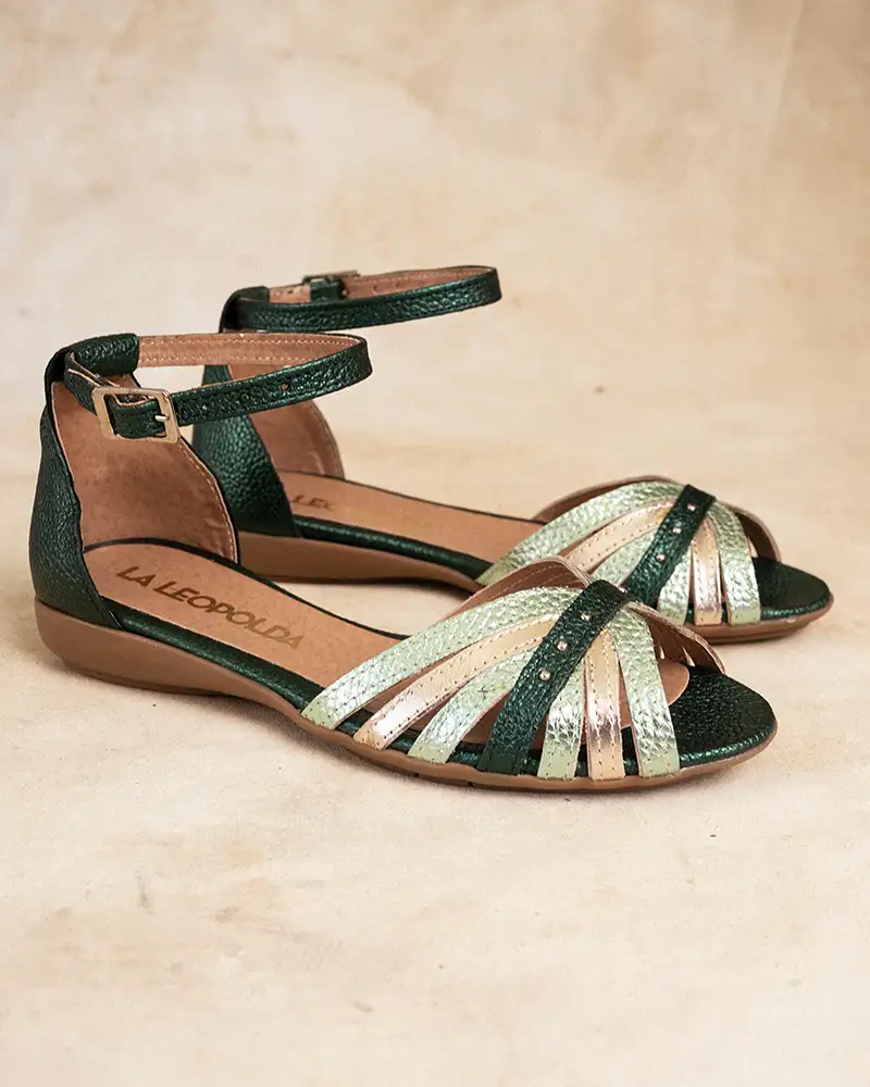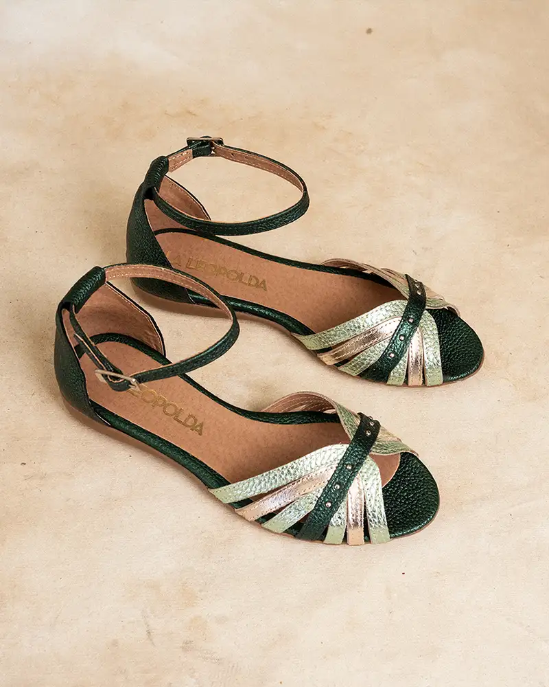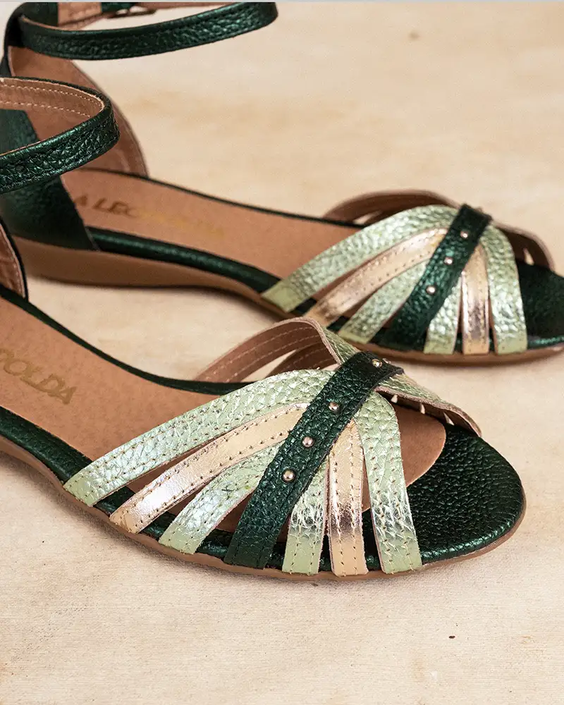 Sandalias bajas Kiku en verde inglés metalizado, menta y platino con base de goma