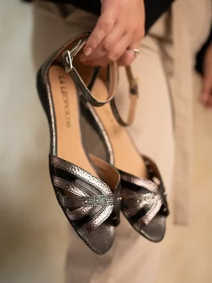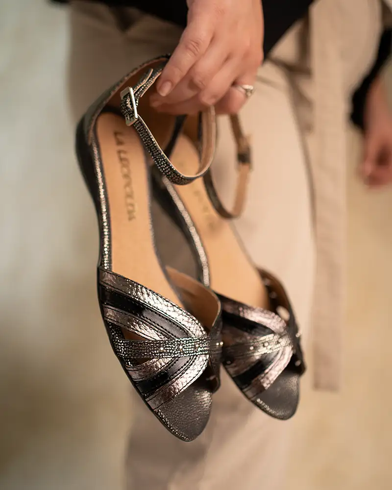Sandalias chatitas de cuero negro salpicado en metalizado combinado con peltre Kiku