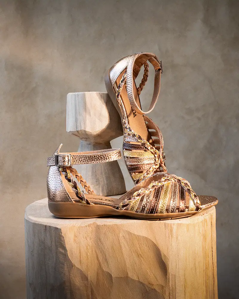 Hechas en cuero color cobre con una trencita que recorre toda la capellada y tiritas en mix de metalizados, combinan brillo y frescura..