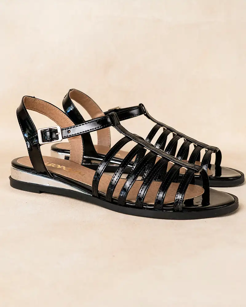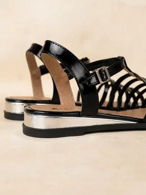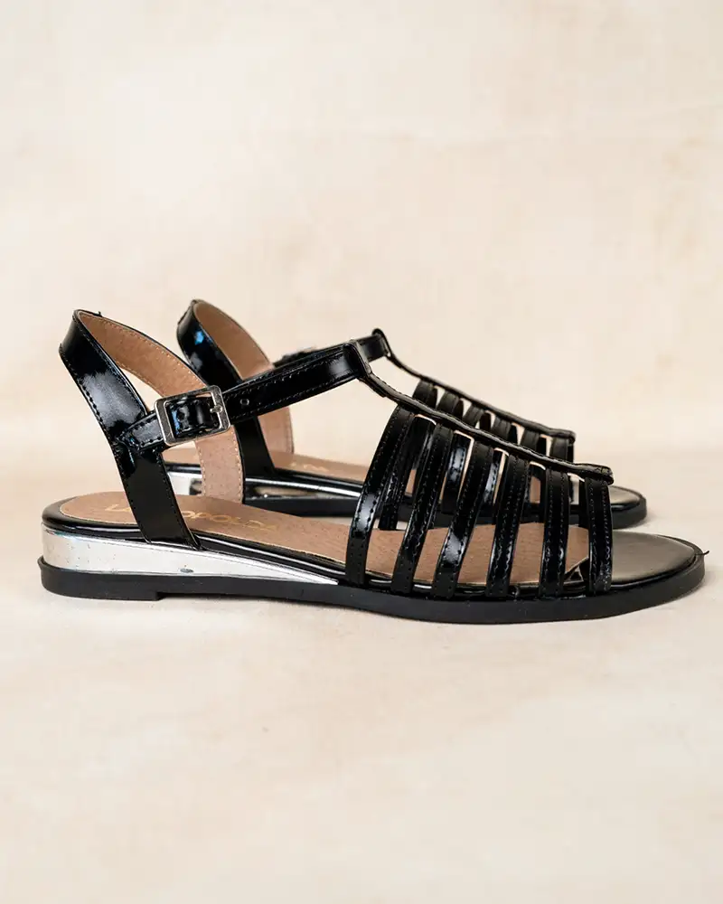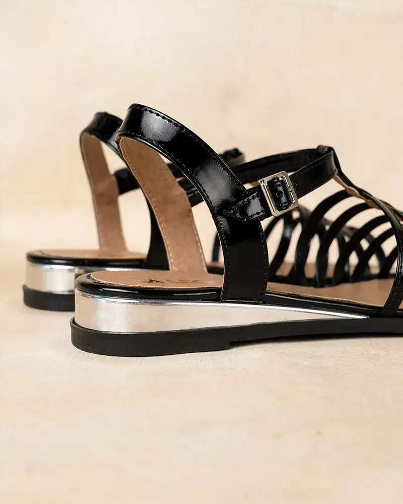 Sandalias de charol negro con tiras y taco niquelado Lujan