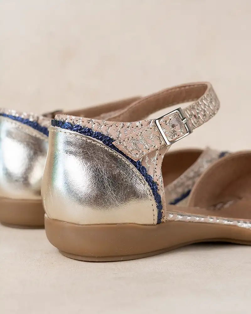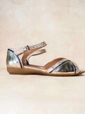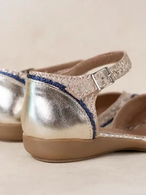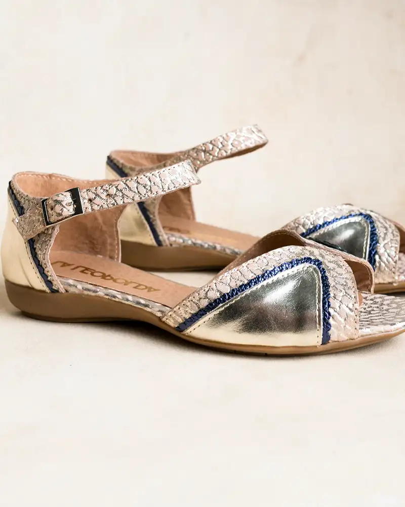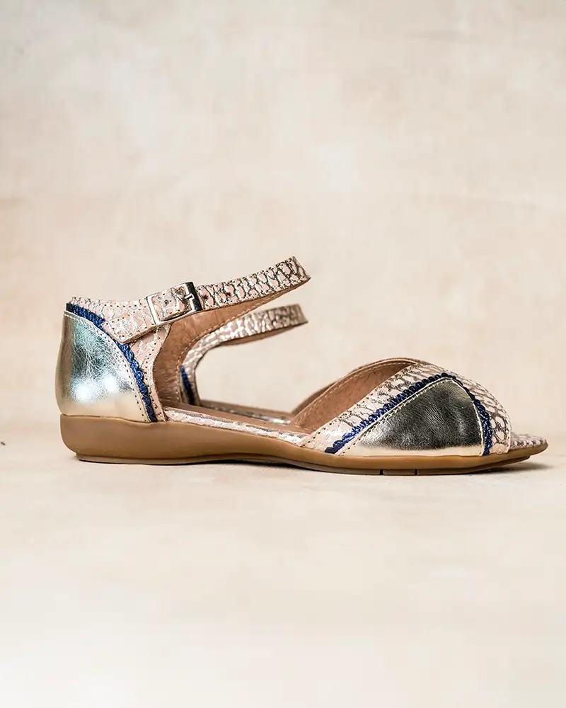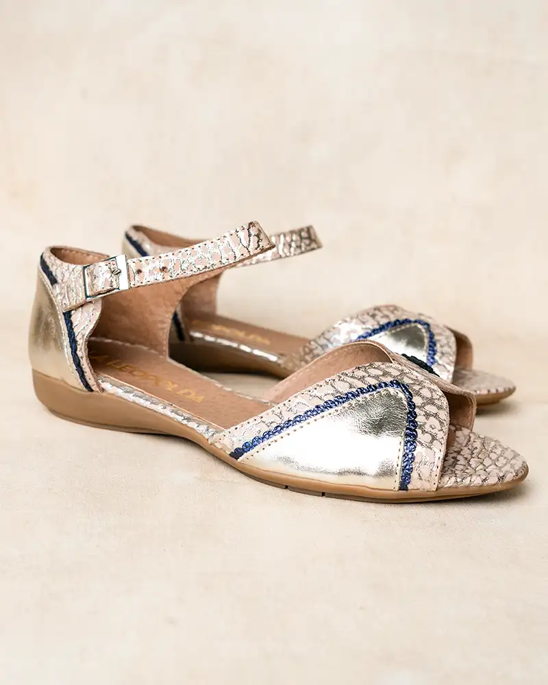 Sandalias chatitas de cuero croco beige y platino metalizado combinado con cuero liso platino y ribete en azul Iguazú