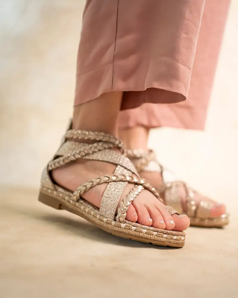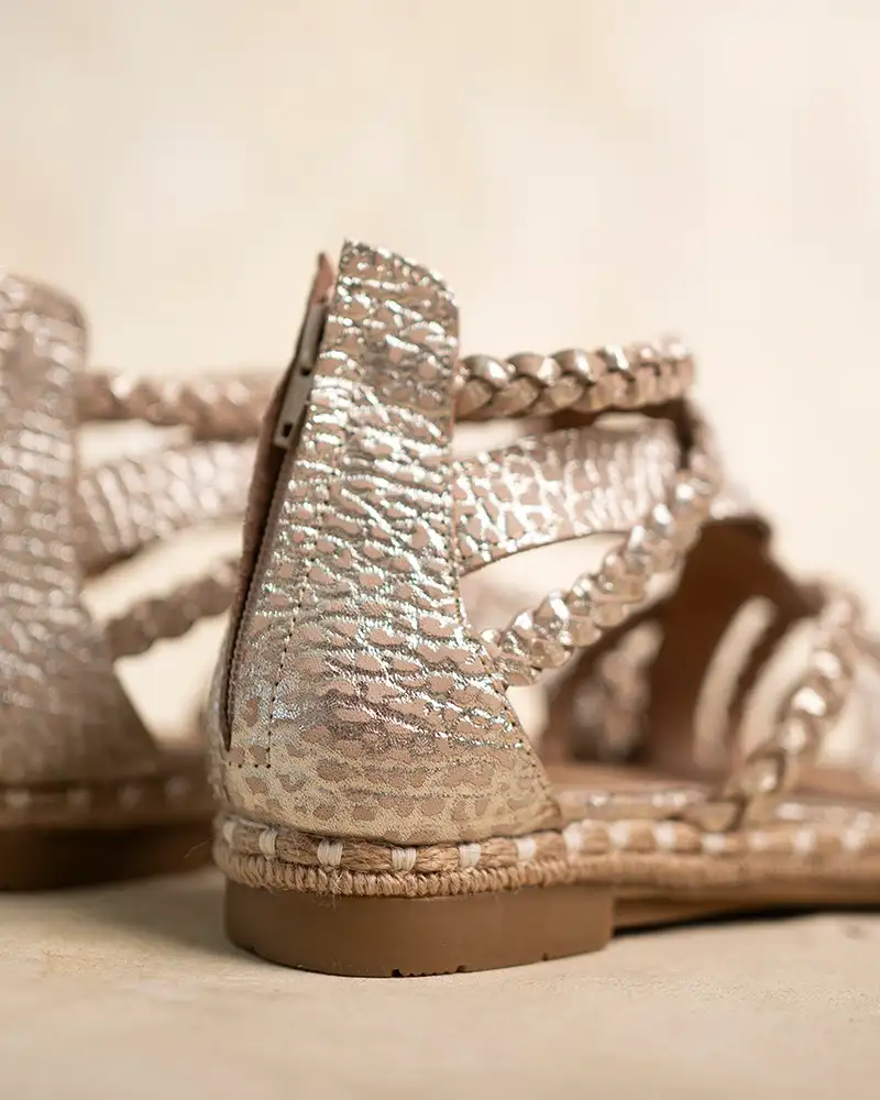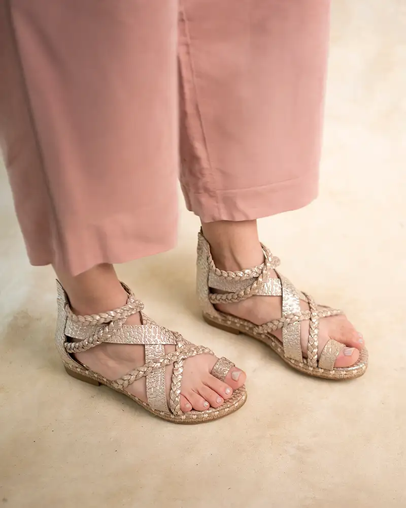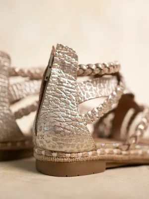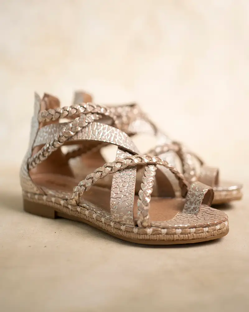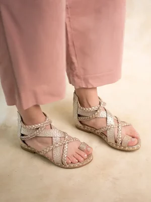 Sandalias Rajesh de cuero platino con tiras cruzadas y trenzas
