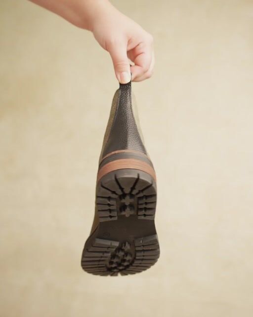 La base es de goma TR, con dibujo tipo neumático, lo que hace que camines súper segura, agarrándote bien al piso. Tiene una vira rústica que recorre todo el contorno y un taquito foliado en madera que le da el toque final de rusticidad.